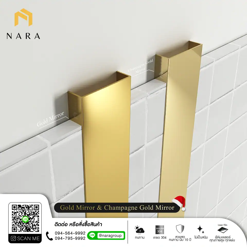 สแตนเลสสีแชมเปญของ NARA Stainless ผลิตจากสแตนเลสเกรด 304 คุณภาพสูง ใช้สารเคลือบอย่าง Titanium Nitride (TiN) หรือ Chromium Nitride (CrN) ซึ่งมีคุณสมบัติป้องกันรอยขีดข่วน ทนต่อแสง UV และความชื้น ทั้งยังปลอดภัยต่อสุขภาพ เหมาะทั้งสำหรับงานภายในและภายนอกอาคาร