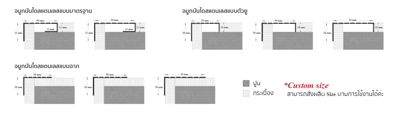 • เรารับดีไซน์จมูกบันไดกระเบื้องทุกรูปแบบ ไม่ว่าจะเป็นขนาดพิเศษหรือลายพิเศษ เพื่อเสริมเอกลักษณ์สะท้อนความเป็นตัวคุณ โดยทีมงานผู้เชี่ยวชาญด้านงานสแตนเลสมากกว่า 15 ปี