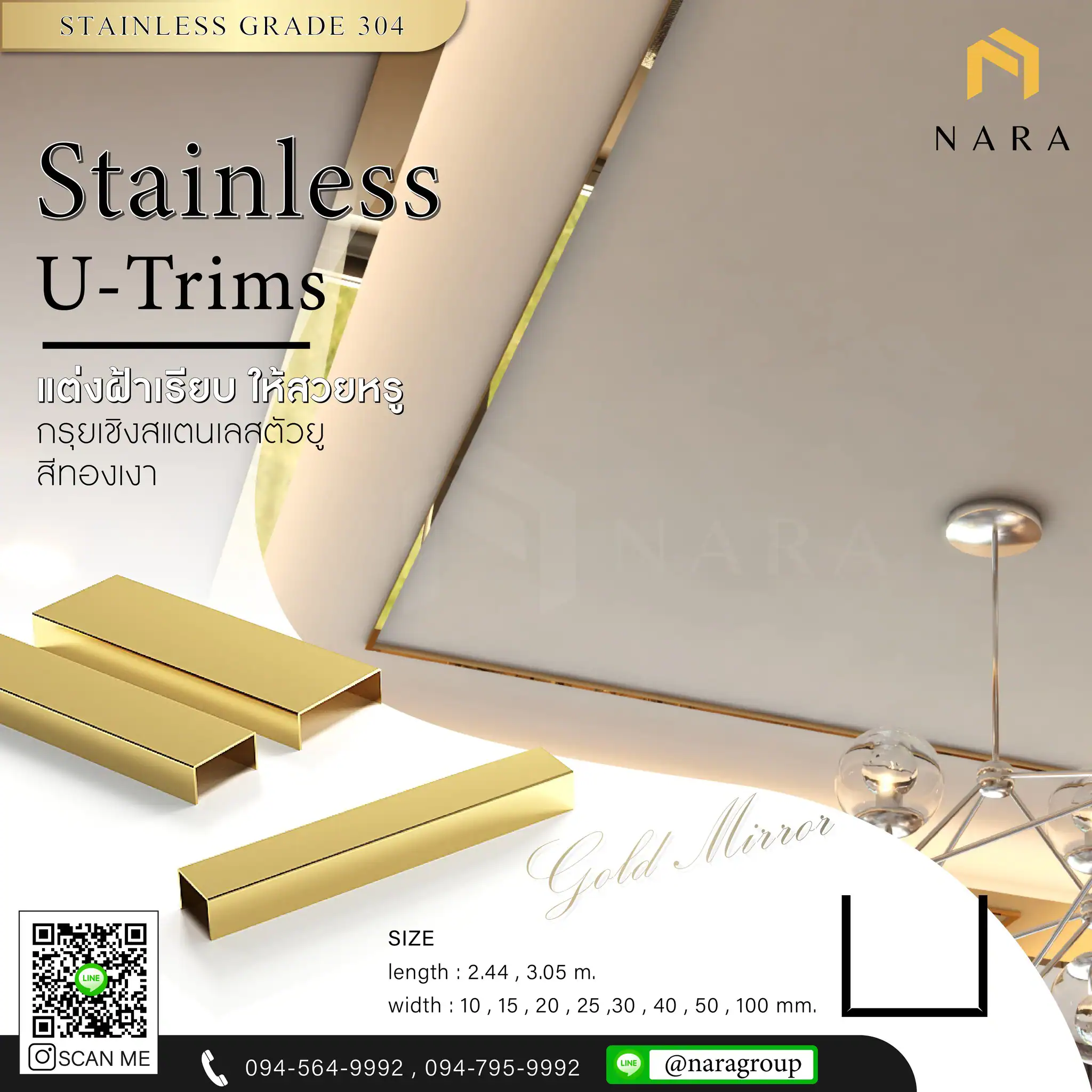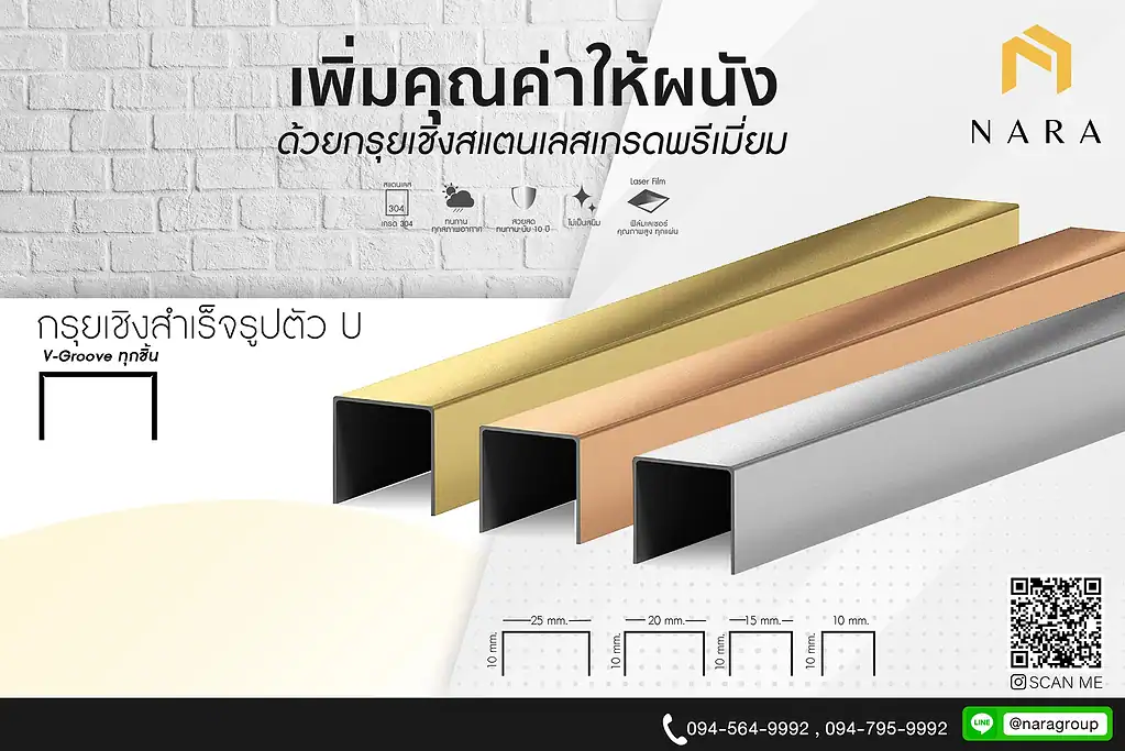 คิ้วสแตนเลส 15 มม. และ สแตนเลสพับตัวยู ช่วยเพิ่มความหรูหราและทันสมัยด้วยการออกแบบที่เรียบหรูและทนทาน คิ้วสแตนเลสตัวยูจาก NARA Stainless เหมาะสำหรับการตกแต่งทั้งภายในและภายนอกอาคาร เติมเต็มความสวยงามให้กับพื้นที่ของคุณอย่างมีระดับจากผู้เชี่ยวชาญด้านงานสแตนเลส พร้อมบริการดีไซน์พิเศษผ่านกระบวนการ วีคัท สแตนเลส (V Cut) และงานฉลุลายพรีเมียม การันตีความคุ้มค่าและคุณภาพที่ทนทานในทุกการใช้งาน