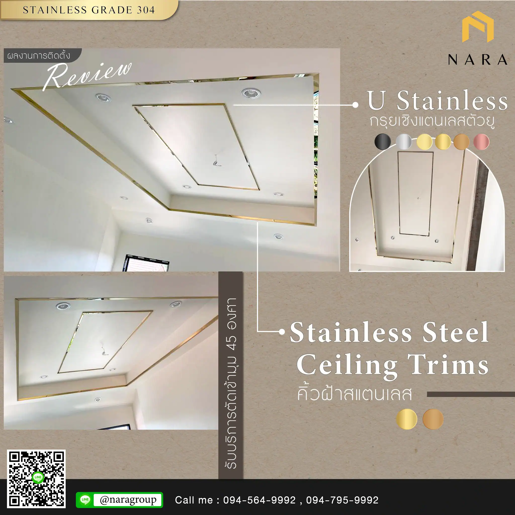 - สแตนเลสพับตัวยู เพิ่มลูกเล่นให้ให้กับเพดานด้วยการติดฝ้าสแตนเลส คิ้วสแตนเลสติดเพดาน บนฝ้าเรียบ โดยขนาดที่นิยมจะเป็นหน้ากว้าง 50 มม. ขึ้นไป